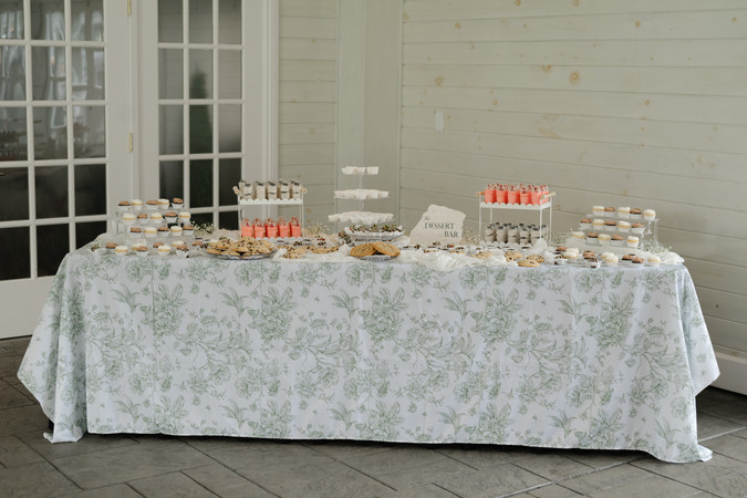 Dark green floral patterned linens set the foundation for an elevated, romantic aesthetic, beautifully contrasted by light mint napkins that added softness and dimension to each place setting. The interplay of tones created a fresh, refined palette that allowed every detail to stand out.