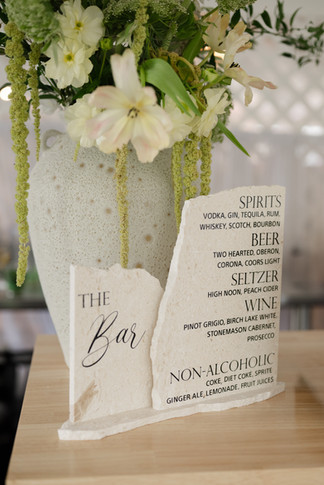 Statement florals brought movement and artistry to the reception design. Some arrangements reached upward with cascading blooms that draped gracefully downward, while others remained low and lush, creating a balanced and visually dynamic tablescape. Stone table numbers and bar signage added an organic, textural element, while custom décor pieces featuring the couple’s beloved cats brought personality and warmth to the space.